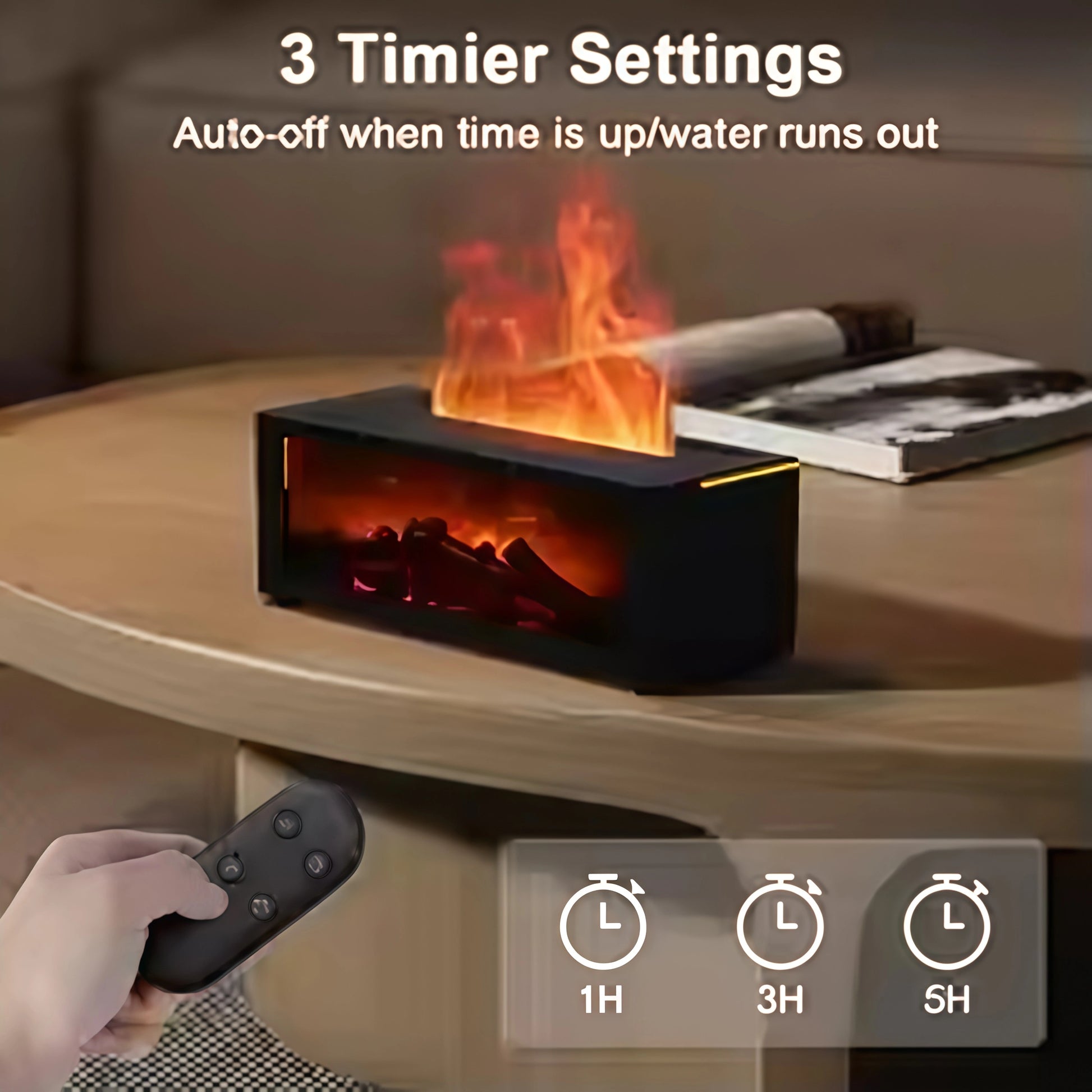 Customize your experience with the Creative Fireplace Diffuser's three timer settings (1H, 3H, 5H). Set it and forget it — the auto-off function ensures safety and convenience when the timer runs out or the water is used up. Perfect for relaxation without the worry.