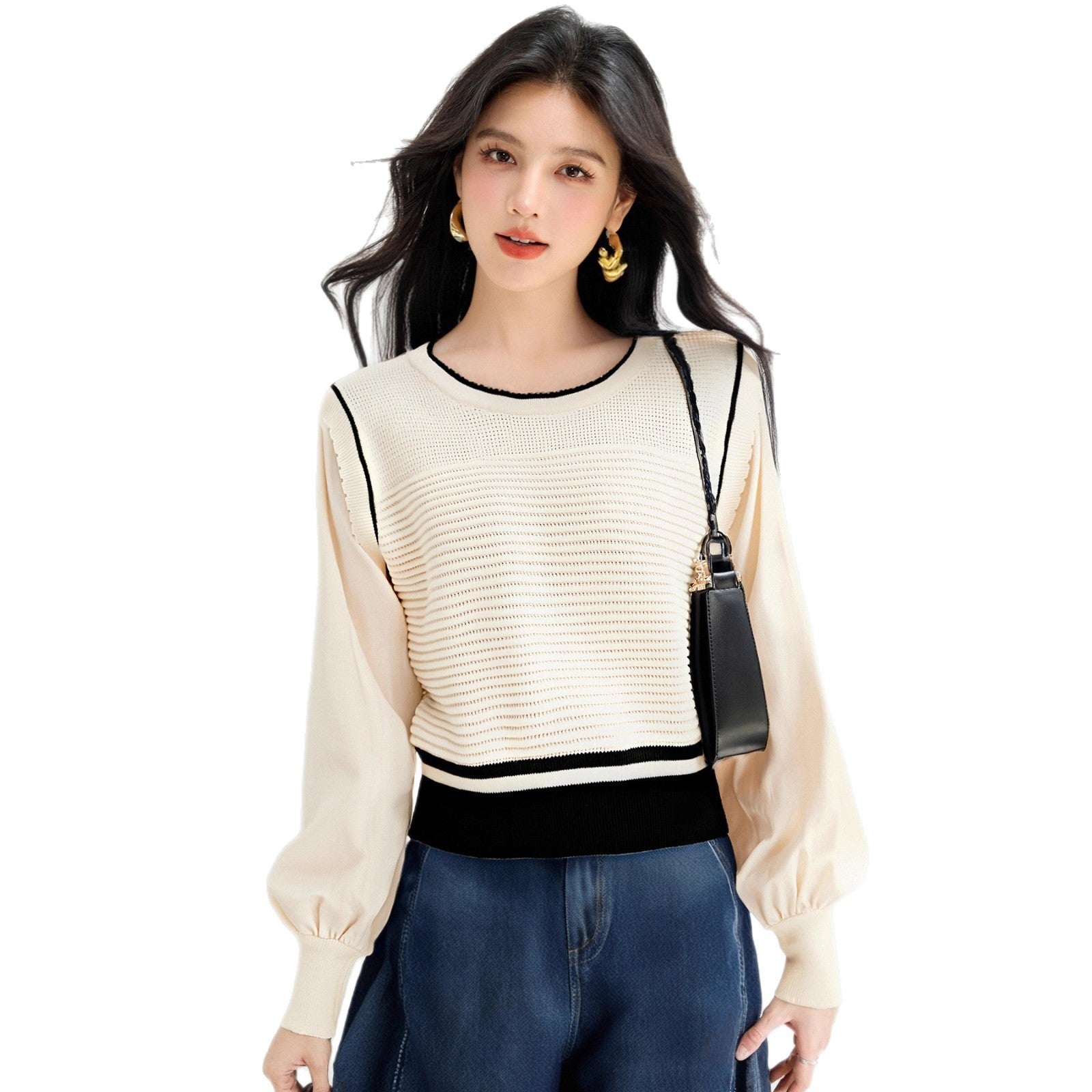 Soft style cozy knit top for women, unique and stylish two-piece design, autumn new arrival, ribbed sweater with contrast stitching